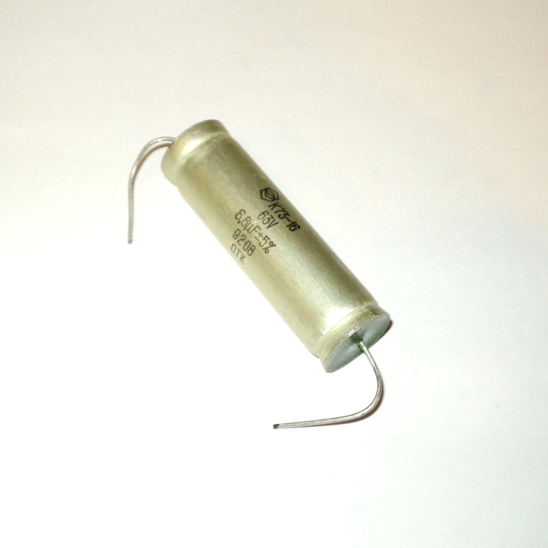 К73-16 63В 6.8 мкф конденсатор постоянной емкости полиэтилентерефталатный (лавсановый, майларовый) металлизированный. Предназначен для работы в цепях постоянного, переменного, пульсирующего токов и в импульсных режимах. Характеризуются высоким сопротивлением изоляции и высокой температурной стабильностью параметров. Конструкция: алюминиевый корпус, разнонаправленные (аксиальные) выводы.