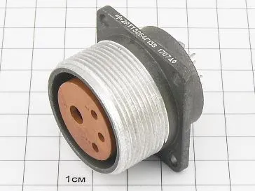 Цилиндрический низкочастотный соединитель 2РТТ32Б4Г13В пылебрызгозащищенный, предназначен для работы в электрических цепях постоянного и переменного  токов частотой до 3 МГц при напряжении до 850 В (амплитудное значение).