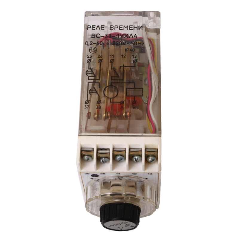 ВС-33-2 (0.2-60час. 220в) реле времени выступающего исполнения с передним присоединением проводов применяется для получения независимой выдержки времени. Реле времени применяется в схемах, где необходимо автоматически выполнить какое-то действие через определенный промежуток времени. Реле электромеханическое, с приводом от синхронного электродвигателя. Механизм реле размещен в пластмассовом корпусе, на лицевой части реле выведен переключатель поддиапазона установок и ручка установки выдержки времени. В комплекте с реле может поставляться колодка для крепления реле.